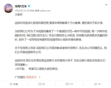 其中有這樣一句話:每一次製作視頻的時間,我們團隊用盡全力,完全只想到怎麼衝收視,卻忽略為獲得更多流量的同時,創作了一些帶有恐怖題材的視頻帶給小朋友傷害和影響。