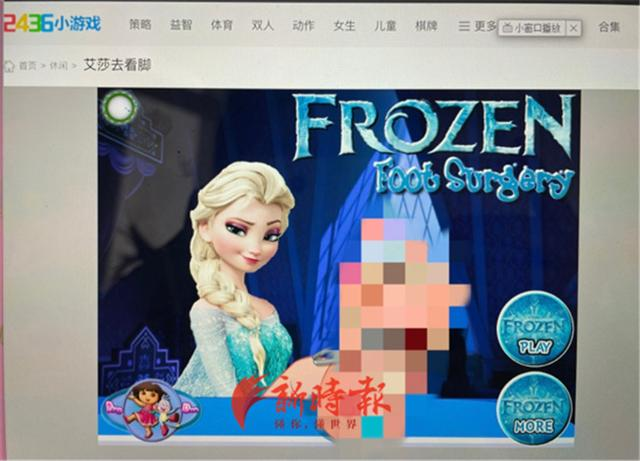 比如較受年幼兒童歡迎的動畫片《冰雪奇緣》,在某網站的根據《冰雪奇緣》改編的小遊戲合集中,除了有正常的美妝遊戲、換衣遊戲外,還有幾款帶有“手術”性質的小遊戲。