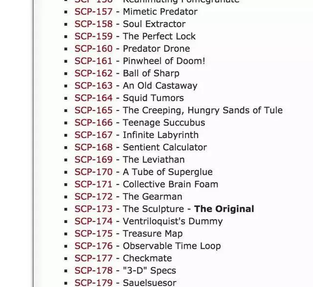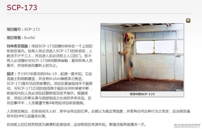 “SCP”系列起源於2007年美國網友于4chan論壇上發佈的一篇恐怖小説,小説以機密資料的口吻虛構了一個叫“SCP”的機構,該機構收容了一個危險生物,編號173。