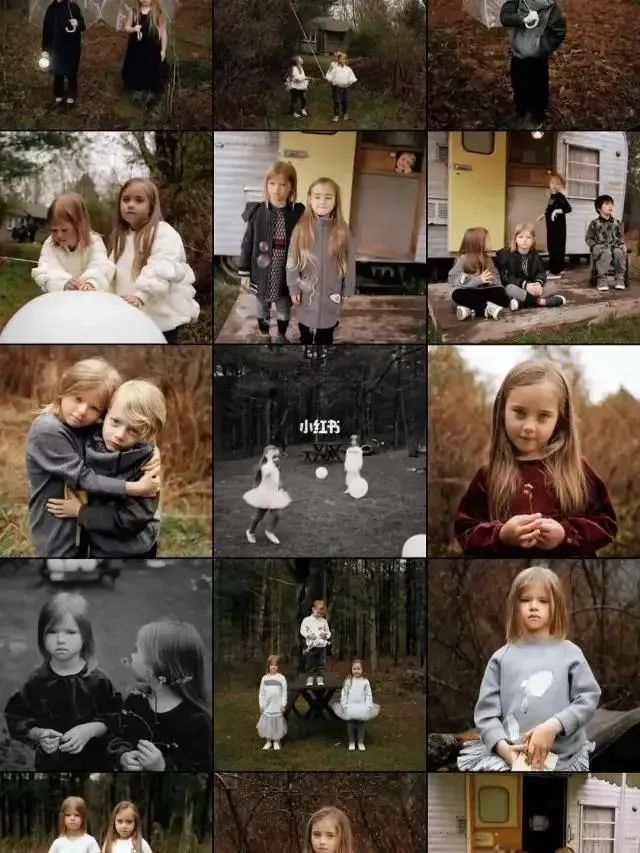 除了衣服設計很“陰間”,這個品牌的宣發也喜歡使用各種“陰間濾鏡”,品牌官方ins賬號發佈的多張宣傳攝影圖,還刻意讓兒童模特配合道具擺出詭異的造型,我都懷疑攝影師是拍恐怖片出身。