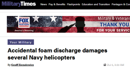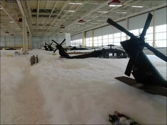 比如2014年,俄克拉荷馬州塔爾薩國民警衞隊的機庫也曾發生過類似的意外事故,6架“黑鷹”直升機被消防泡沫淹沒。