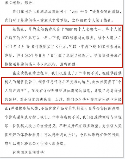 “該個人用户在2021年4月15日付款購買了399元可以一年內下載1000張素材的套餐,並於2021年9月7日下載了您的2張圖片。銷售價格分成嚴格按照簽約供稿人協議來執行,沒有差錯。”