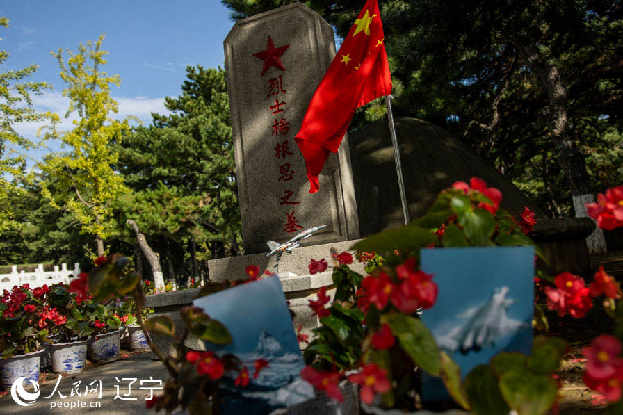 烈士黃繼光的墓碑前擺放着國產先進戰機的照片。人民網 那其灼攝