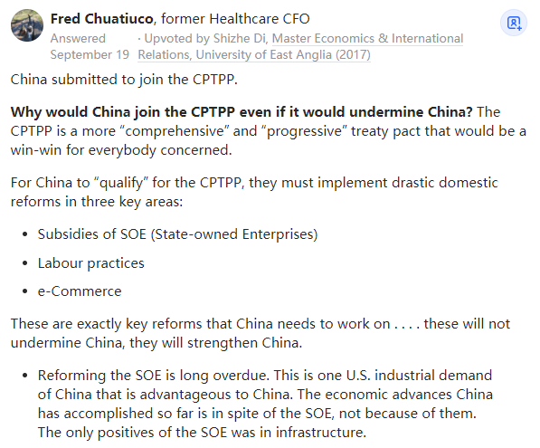 當中國加入世貿組織時,它也必須進行更多的改革,但這些改革實際上都是它本身就想做的。我相信中國已經研究過CPTPP,並且在加入WTO時也在遵循了同樣的劇本。