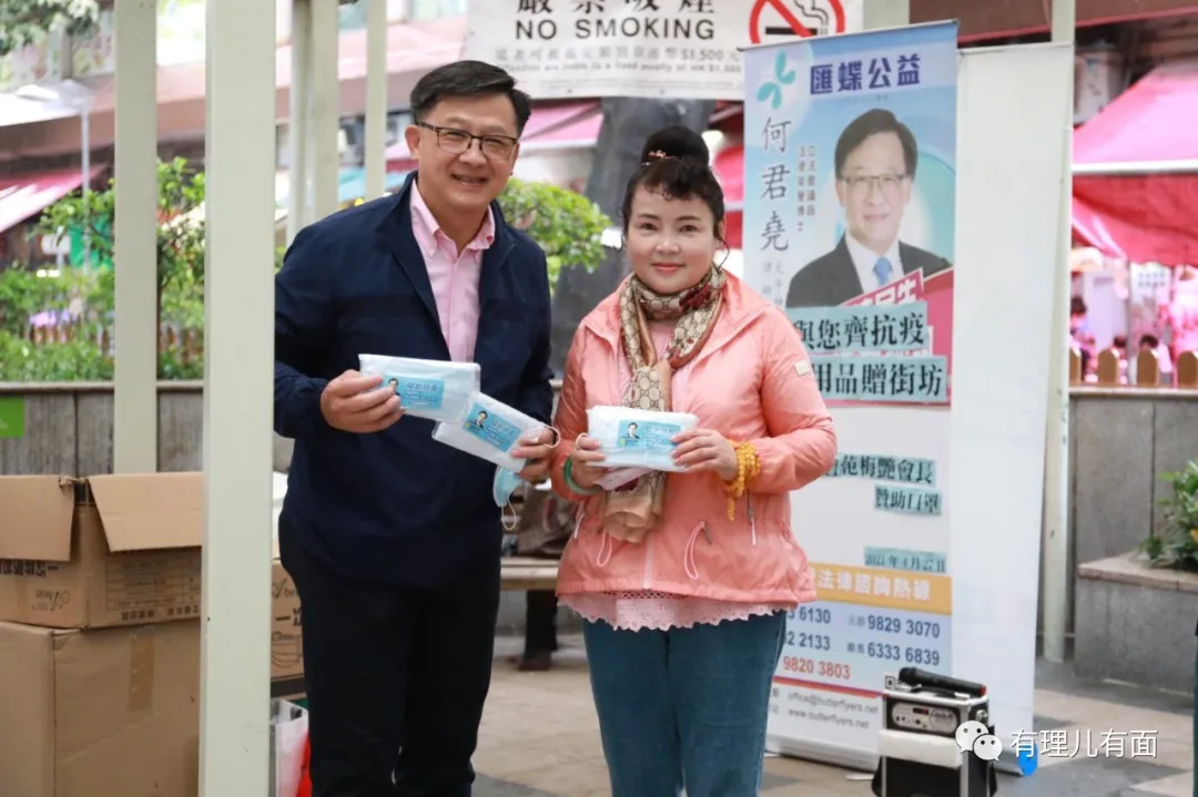 在香港新冠疫情爆發之際,何君堯積極投身抗疫事業,他衝在第一線,鼓勵市民齊心抗疫,並同義工團隊冒雨在屯門置樂花園向街坊派口罩,助力全社會抗疫,雖然天空下着雨,但是淋不熄勇士的熱情和心中那團火。