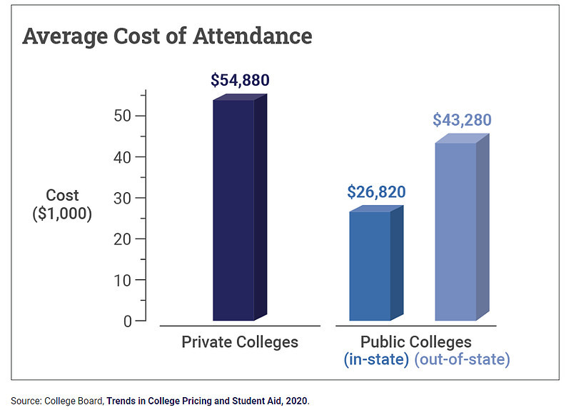 美國大學理事會最新報告中稱,2020—2021學年,美國州內公立大學平均學雜費為26820美元,州外公立大學平均學雜費為43280美元,而全美私立大學平均學雜費為54880美元。