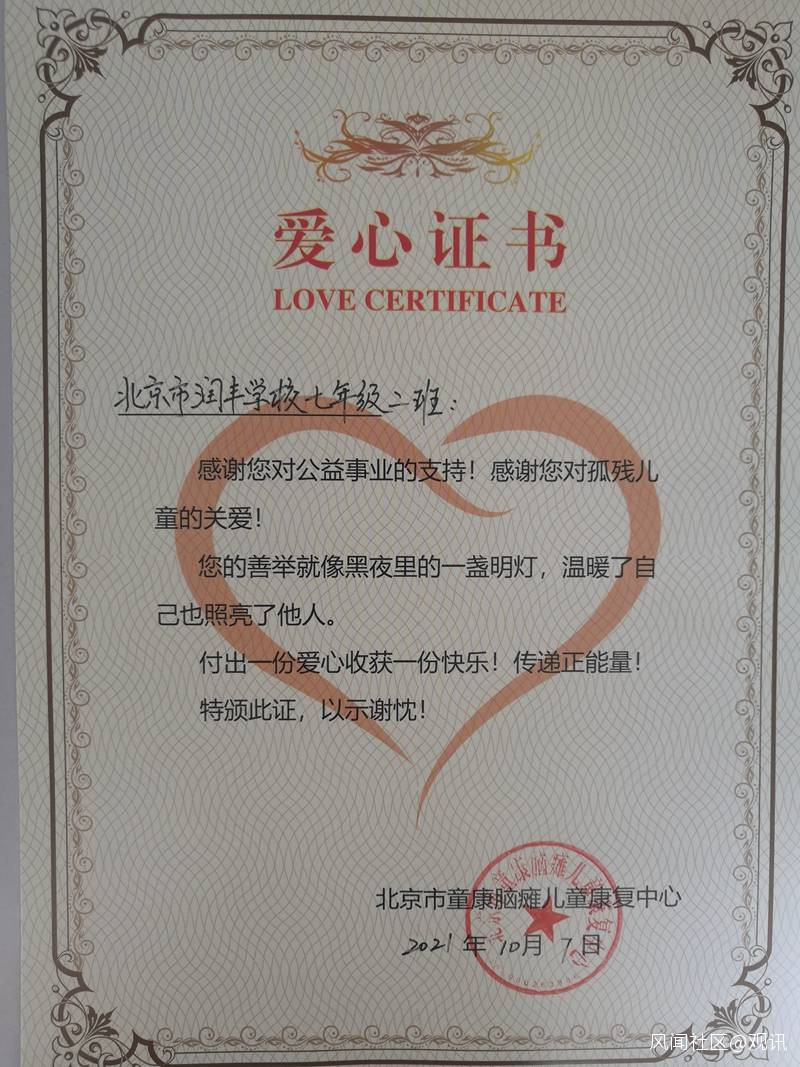 2021年10月7日上午,北京市潤豐學校七年級二班的宗老師帶領同學們走進365晨光寶貝之家,開展了一次特殊的“獻出愛心傳遞温暖”班會。