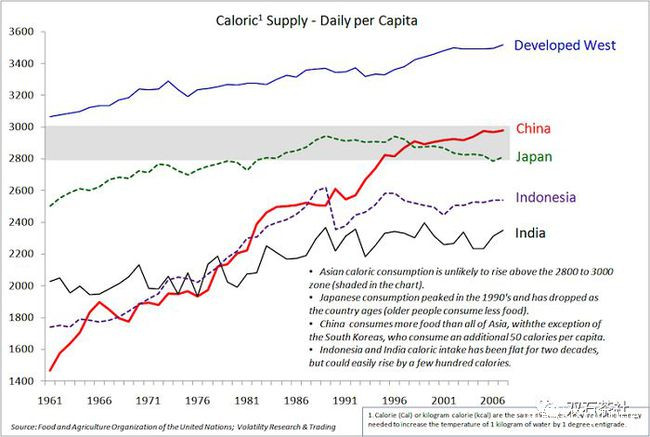 從這張圖可以看出,中國在80年代初跨過2300~2400大卡熱量線