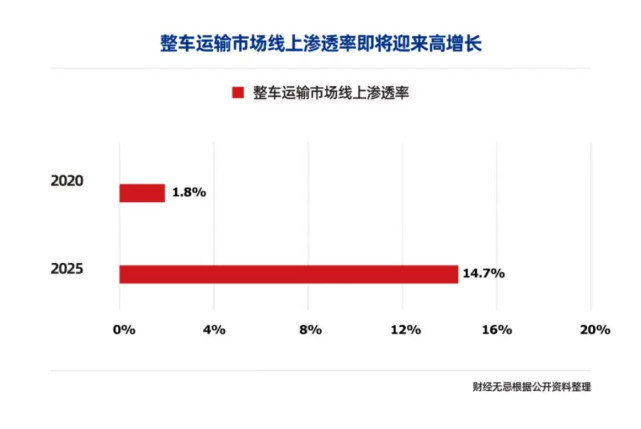 儘管中國公路貨運市場在過去一年裏已經達到了6.2萬億規模,但佔據貨運市場61.3%份額,價值3.8萬億的整車運輸市場,其數字化進程仍然處於起步階段,線上滲透率僅為1.8%,即便伴隨着線上化進程的加速,預計到2025年,這一數字也才能剛剛達到14.7%。
