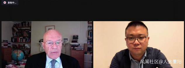 中新社德國分社首席記者、中新網研究院副院長彭大偉近日對話英國著名學者、作家馬丁·雅克(左)。圖為連線畫面。 中新社記者 彭大偉 攝