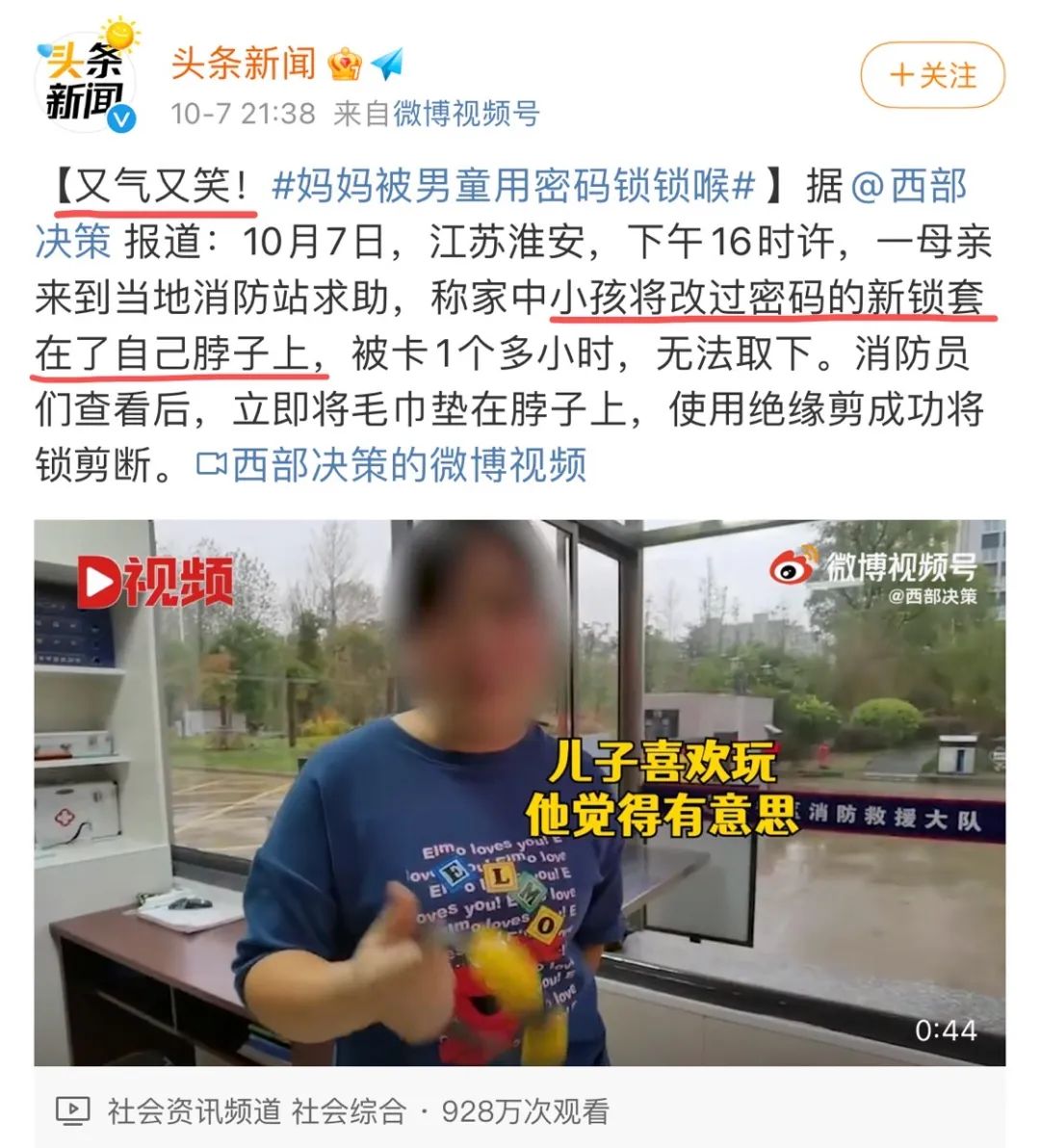 乍一看還以為什麼習武世家在切磋技藝,點進去一看,原來是兒子用環形密碼鎖鎖了媽媽的喉。嚯,這什麼家庭啊,可以同時有兩代人都這麼不靠譜,一個真敢鎖,一個真敢被鎖。