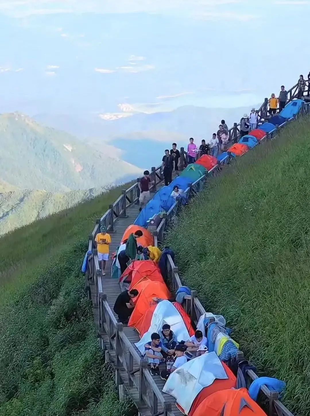 10月2日,舟車勞頓的劉燦和朋友到達武功山景區,首先震驚他的不是驚豔的自然景觀,而是眼前的人山人海。排了1個多小時才坐上了接駁大巴的劉燦,內心還有一絲僥倖,也許到了山上,人就少了?經過兩趟纜車,外加一段段並不輕鬆的徒步跋涉,劉燦在天黑到達山頂露營地點,此刻這裏的帳篷已經“摩肩接踵”,他高價租到一頂舊帳篷時,山頂濃霧升起,氣温驟降。