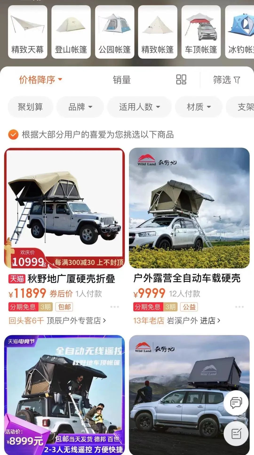 隨着設計美學與消費主義的不斷滲透,露營被分化出一個新的支系——“野奢”,這一支系市場更大,它更側重“體驗”而非“探索”。商家為了提升體驗,不斷升級硬件標準,巨大的天幕和可以瞬間充氣的雙人户外氣墊牀,帶院子的帳篷……電商平台上,搜“露營”可以看到從天幕、帳篷、桌椅、專業爐灶、到餐具、服飾……細分之精密,令人眼花繚亂。