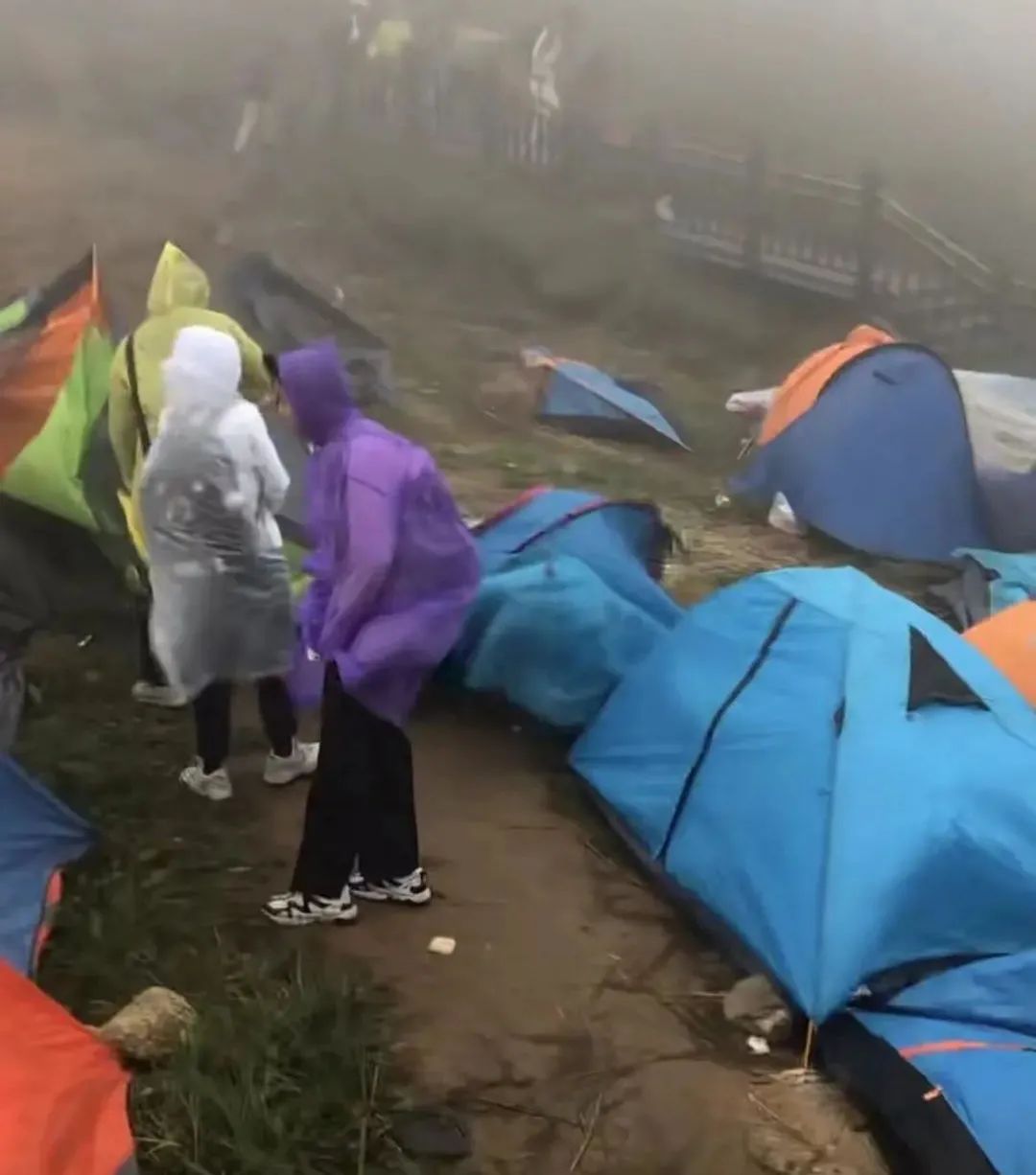 然而,今年的武功山被過度宣傳之後,短時間內的“網紅化”讓它來不及完善硬件設施、軟件服務和規範,就承擔起超負荷的接待量。十一期間,武當山“帳滿為患”的新聞上了電視;視頻網站也不乏“山頂撐滿同款帳篷,女子半夜迷路。”這樣的現場報道;而且就在不久前,武功山露營遭遇極端天氣的視頻也在網上瘋轉,濾鏡美化後的露營畫面在現實面前,彷彿一個卸妝的網紅,判若兩人。