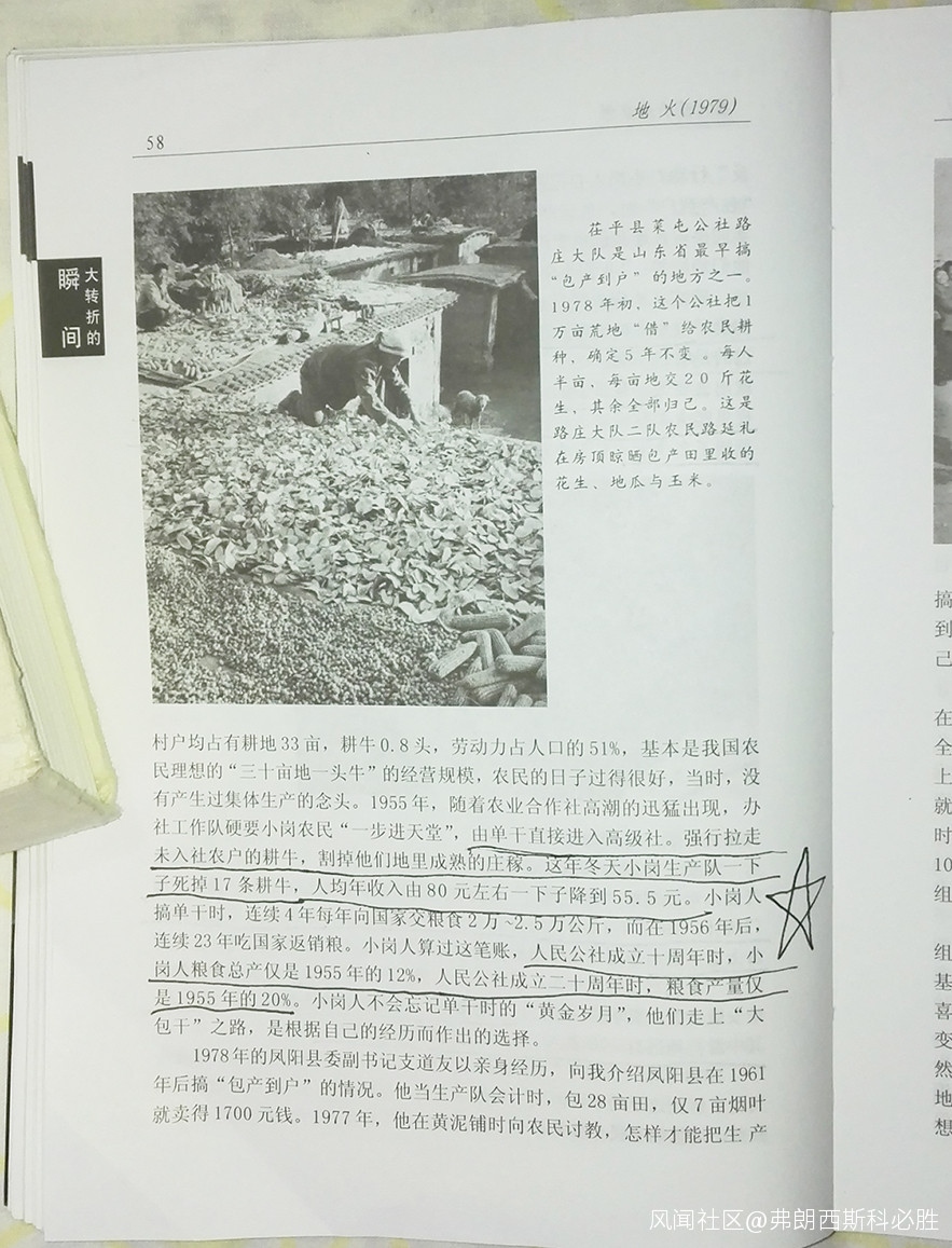 大家知道,著名的安徽省鳳陽縣小崗村的18户村民偷偷的在1978年12月開始實行“大包乾”,掀開了我國農村改革開放——從公社制向“家庭聯產承包責任制”過渡的序幕。實行“大包乾”後的第一年小崗生產隊的糧食總產量就達到了13.3萬斤,相當於它自己此前1955年到1970年那15年的糧食產量的總和!人均年收入則達到了400元,是上一年——1978年(22元)的18倍!而小崗村在1955年實行農業集體化,成立“高級社”——高級農業生產合作社後(小崗沒經歷過互助組和初級社這兩個階段,是直接進入高級社階段的),糧食的年產量開始不斷地減少、下降,到它成立人民公社十週年,即1966年時,糧食的年產量變得只有1955年的12%了,就是説減少了88%!到1976年時,也仍然比1955年少80%。我是從“湖南人民出版社”出版的書《大轉折的瞬間——目擊中國農村改革》中得知這個情況的,那本書中是這樣説的: