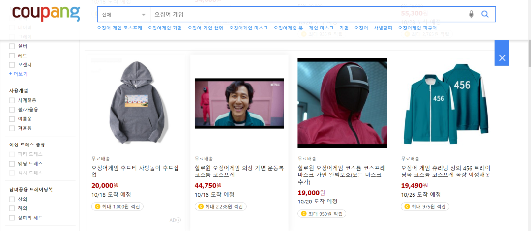 最火爆的還是相關的服飾產品,無論韓國本土還是亞馬遜,亦或者國內的電商平台,圍繞劇中游戲玩家、管理員等角色的着裝,一大批連體衣、外套產品迅速受到追捧,甚至連初入電商界不久的奈飛也下場了。