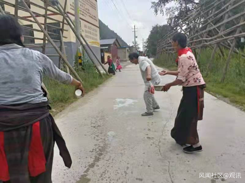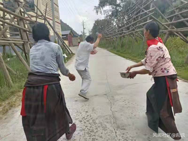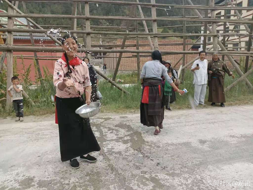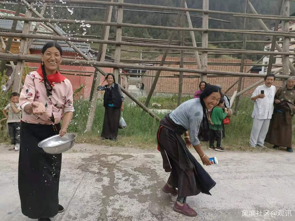 這是筆者在卓尼縣禱告鄉龍多村的村口遭遇到村民祈禱求雨的儀式被祈雨的婦女潑水的情景。