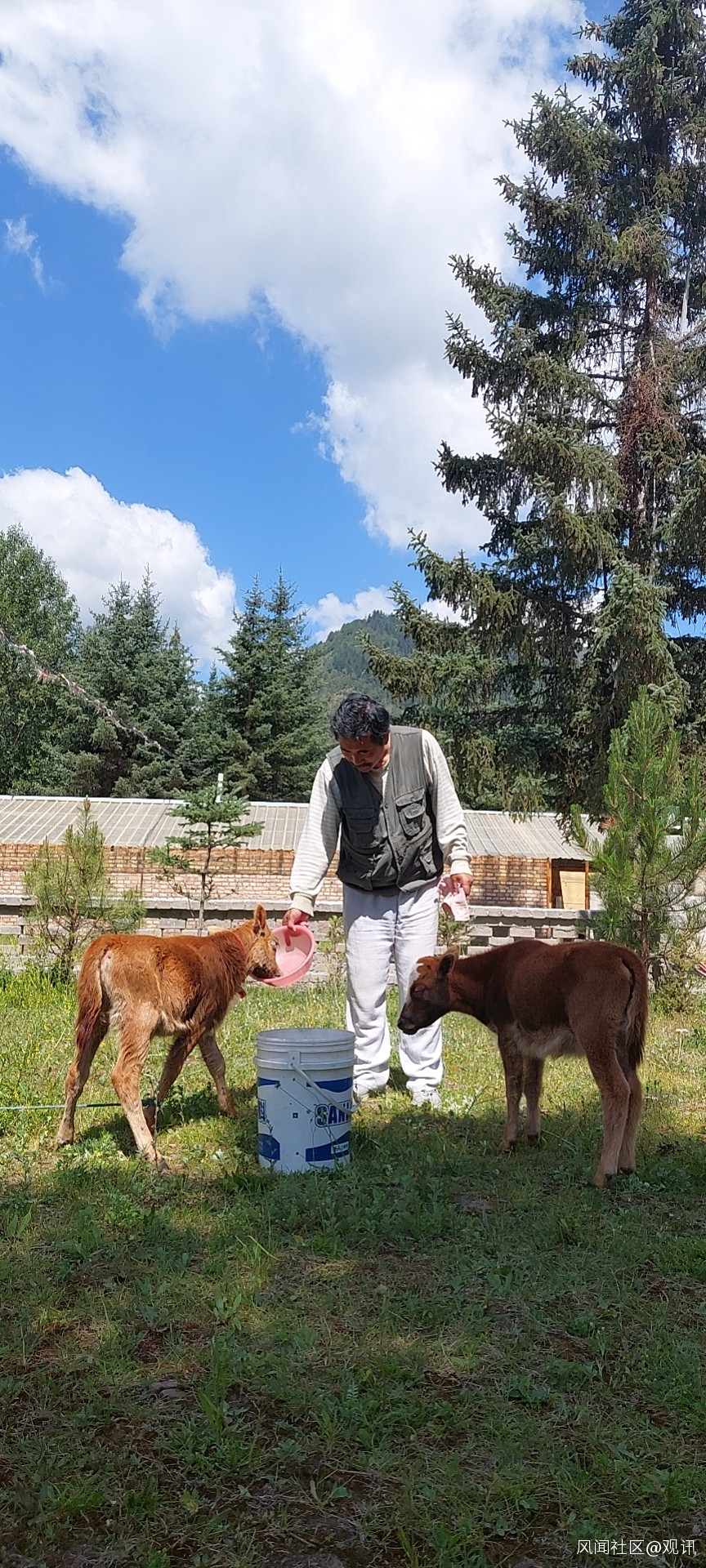 每一天早晨,小牛都在院子裏追逐我玩耍。見到我提了一桶水,就跑過來搶着喝水呢!