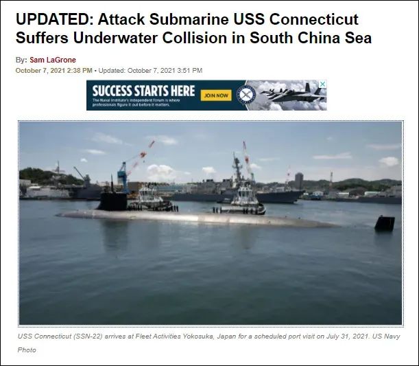 USNI報道截圖,圖中為於7月31日抵達日本橫須賀的“康涅狄格”號海狼級攻擊核潛艇(圖源:美國海軍)