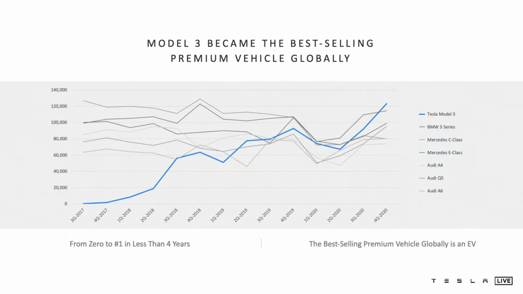 作為特斯拉首款走量車型的 Model 3 則已經超越寶馬 3 系、奔馳 C 級等眾多老牌產品成為目前全球市場銷量最好的單一豪華車型,從開始交付到實現這一目標,Model 3 用時不到 4 年。