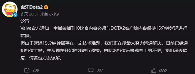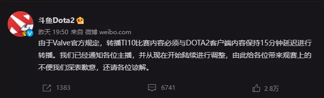起因是鬥魚和虎牙兩平台發微博稱:咱們收到 DOTA2 官方 V 社的通知, TI 的轉播內容必須跟客户端保持 15 分鐘延遲,主播們會陸續按計劃行事。