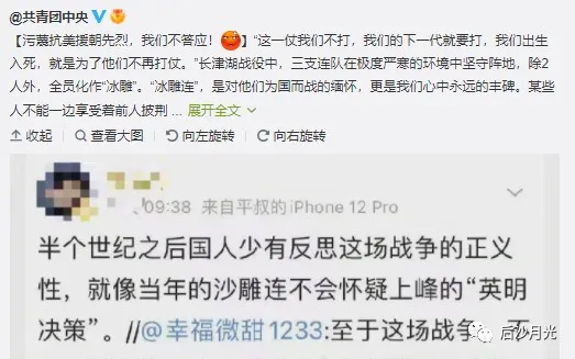 跟那些“反思怪”一樣,他也用“反思”一詞掩蓋其真實用意--顛覆抗美援朝戰爭保家衞國的正義性,還玩弄文字遊戲對“冰雕連”進行公開侮辱。