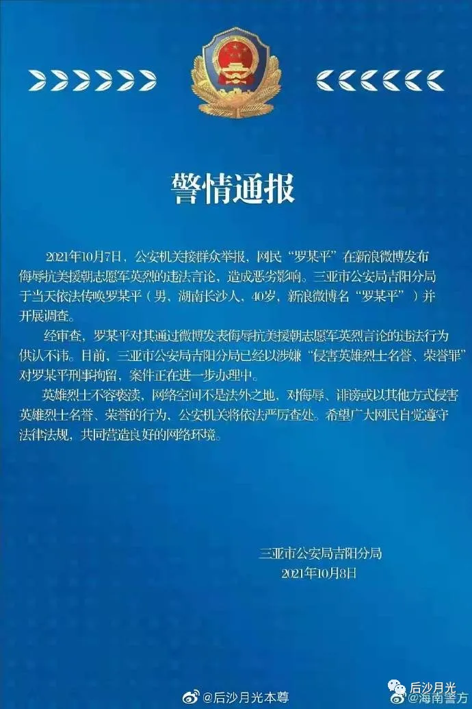 今天,大家期盼已久的藍底白字警方通報終於來了,這速度已經是相當迅速了。羅昌平6日發佈侮辱志願軍英烈言論,三亞警方7日將他拘留,8日發佈通報。但對於網友來説,每一分鐘等待都是漫長的,包括我本人。