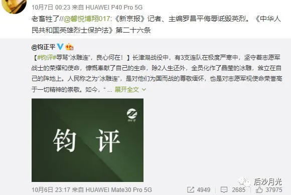 在網絡輿論場上的官微中,解放軍媒體官微@鈞正平 針對此事首先發聲,《辱罵“冰雕連”,良心何在?》。羅昌平不用再想玩弄什麼文字遊戲混淆視聽,他的言行就是在侮辱英烈!必須承擔法律後果。