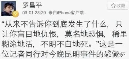 這是人説的話嗎?他假借所謂同事的話,編髮了一條喪心病狂的微博,不去譴責恐怖分子,卻試圖將問題歸結於社會和體制。這就是羅昌平的一向“風格”,那麼,他吸引到的粉絲,也必然是恨國敗類們。