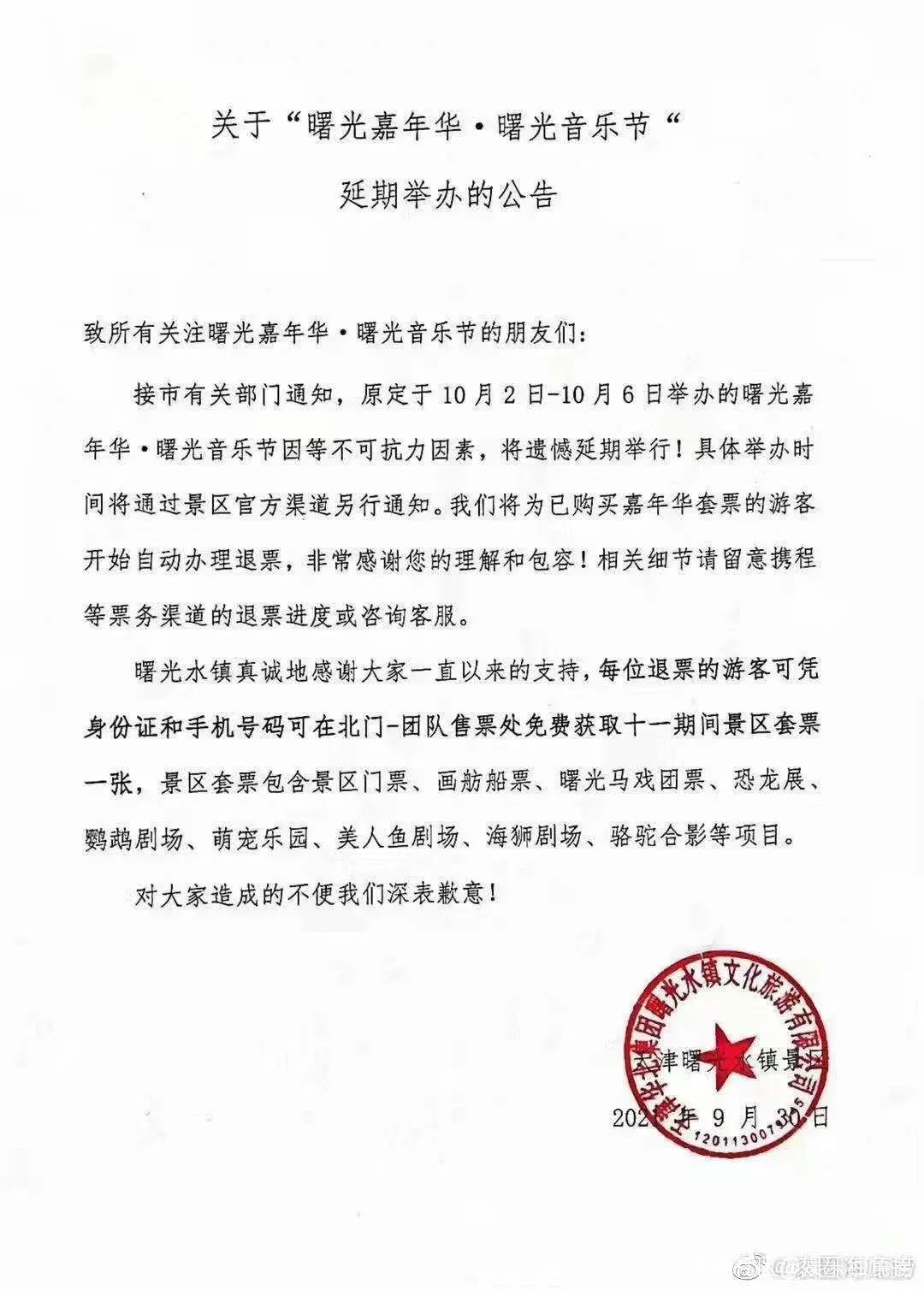 就在同日,原定於10月2日-6日在天津舉辦的曙光嘉年華·曙光音樂節也因不可抗力因素延期。有趣的是,主辦方曙光水鎮在為已購票的遊客辦理自動退票的同時,還另送一份“歉禮”撫慰樂迷們受傷的心靈,允諾免費贈予被退票樂迷十一期間的景區套票,包含畫舫船票、馬戲團票、鸚鵡劇場、恐龍展、美人魚樂園,令部分樂迷啼笑皆非。