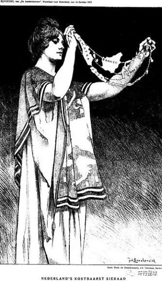 **荷蘭是世界最大羣島國家印尼的“製造者”。**這片羣島曾被荷蘭女王視為尼德蘭最珍貴的珠寶。1916年荷蘭報紙《阿姆斯特丹人》刊登新藝術風格繪畫《荷蘭最珍貴的珠寶》,象徵荷蘭帝國的女神手捧珍珠項鍊,鑲嵌印尼羣島圖案,表達荷蘭對荷屬東印度的珍視。