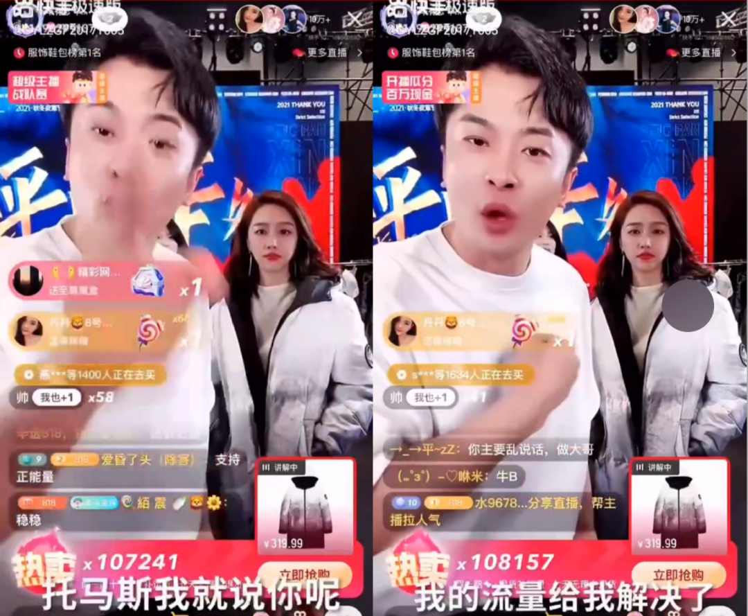 4個月過去,這種情況並沒有好轉。10月7日,辛巴再一次在直播間怒斥快手相關負責人托馬斯,“把欠我的流量還給我”。站在一旁的初瑞雪 (辛巴妻子) 緊急救場,將辛巴趕出直播界面,奪走手機並讓工作人員趕緊下播。