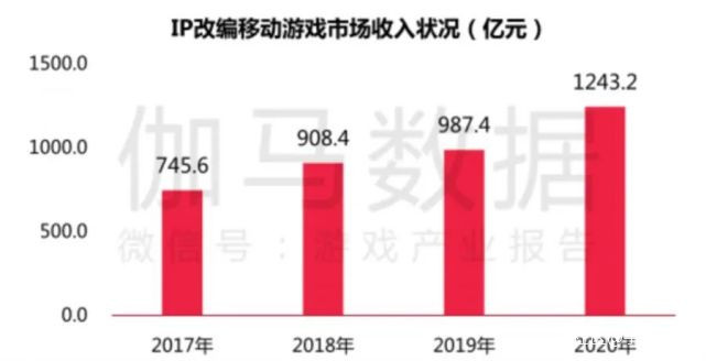 伽馬數據相關報告顯示,自2017年開始,IP改編移動遊戲市場收入逐年遞增,2020年收入首次突破千億大關,達1243.2億元之多,且未來仍有廣闊增長空間。