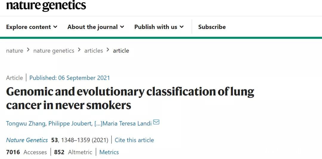 近期,以封面論文形式發表在《自然-遺傳學》(Nature Genetics)的一項重磅研究對無吸煙史的肺癌患者進行全基因組分析,研究結果顯示,無吸煙史肺癌患者的癌細胞主要由人體自然生理過程中基因突變的累積導致。據論文介紹,當前這項研究“首次揭示了無吸煙史肺癌患者中存在三種不同的肺癌分子亞型”,基於這三種亞型的進展特徵給予更加精準化地治療或將有助於改善這部分患者的預後。