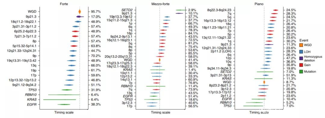 此外,基因組分析還揭示了無吸煙史肺癌患者中存在的3種新的分子亞型,研究人員基於不同的體細胞拷貝數變異(SCNA)水平將這三種亞型分別命名為“piano”、“mezzo-forte”以及“forte”亞型: