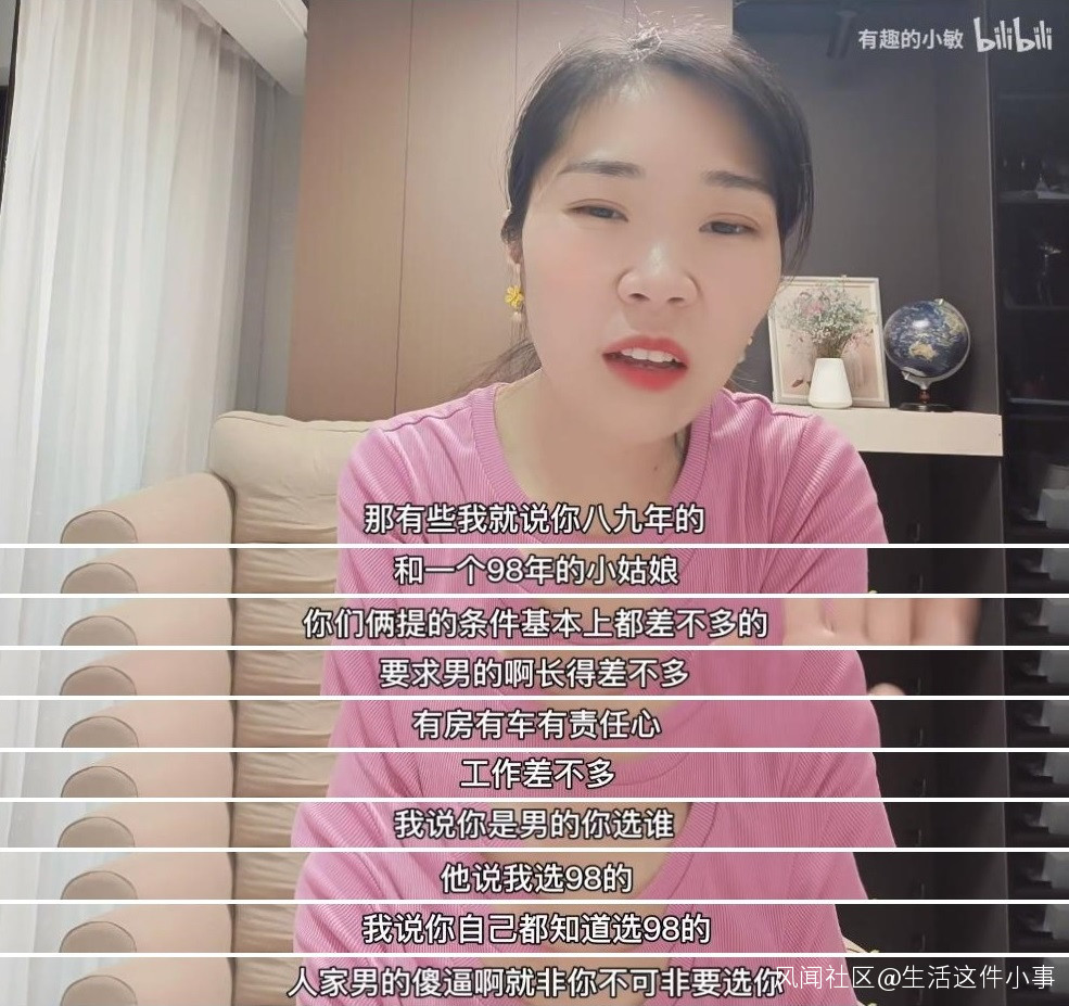 換位思考一下,如果男方各方面條件都不錯,一個18+的女性和一個30+的女性擺在他的面前,男方會作何選擇?“你89年的和一個98年的小姑娘,你們倆提的條件基本上都差不多的,要求男的長得差不多,有房有車有責任心,工作差不多,我説你是男的你選誰。”