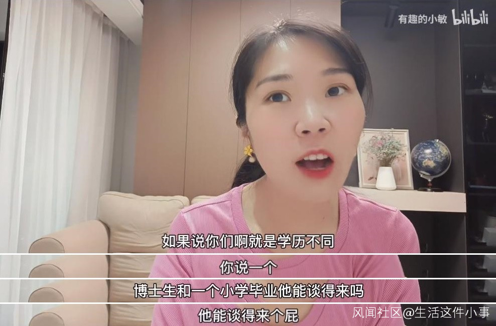“談得來”意味着雙方要有相同的家世、相同的消費觀、相同的學歷等等。“如果説你們啊就是學歷不同,你説一個博士生和一個小學畢業,他能談得來嗎?他能談得來個屁。”