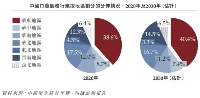 據灼識諮詢的數據統計,華東地區2020年佔中國口腔服務行業的38.6%,預計2030年將達到40.4%。這意味着在未來華東地區的口腔服務機構成立得更多,競爭也將更為激烈。