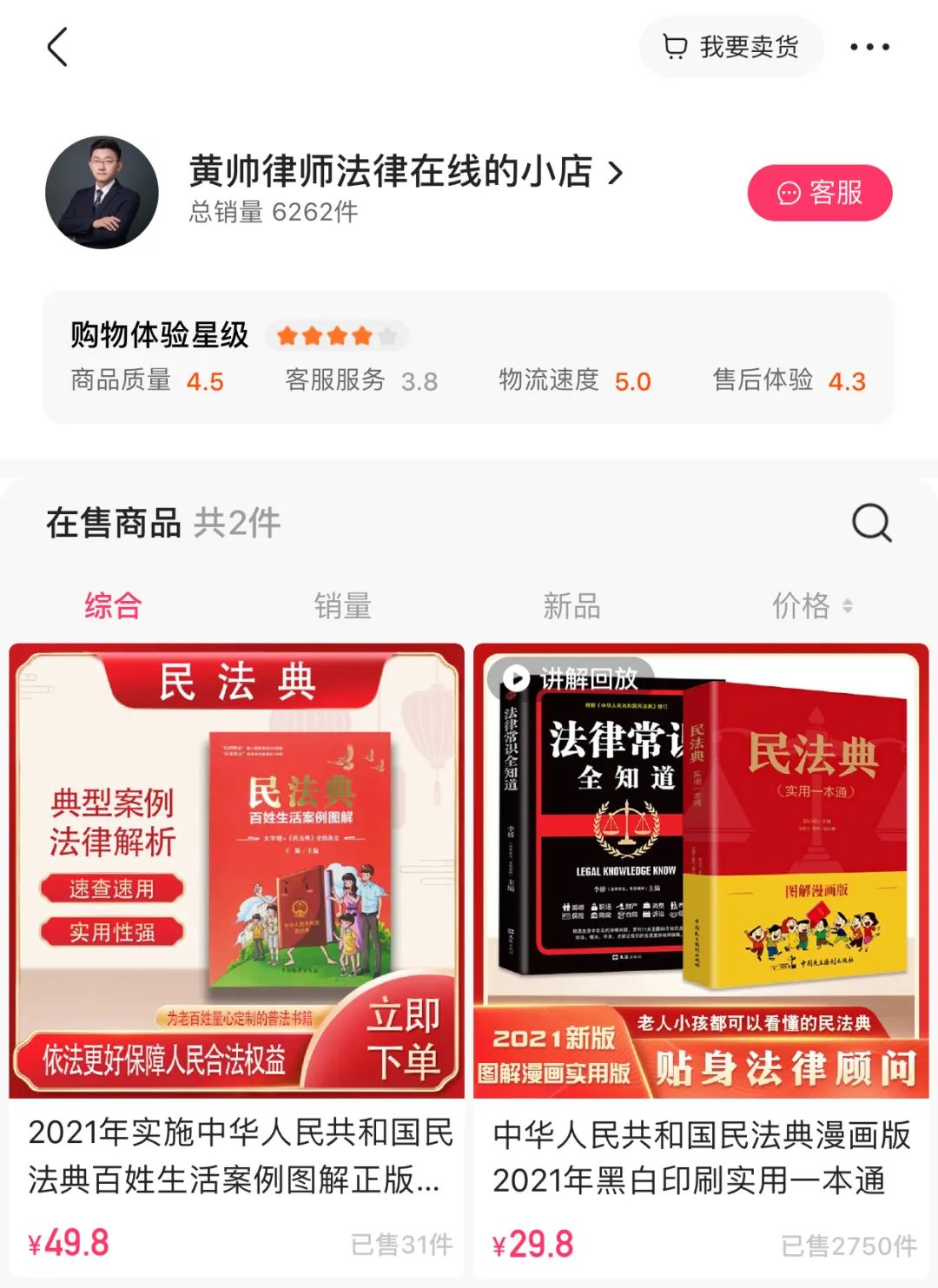 快手上有一個「小店」板塊,非常方便律師在普法之餘延伸業務,很多律師在這裏賣東西,黃律就是其中一位。
