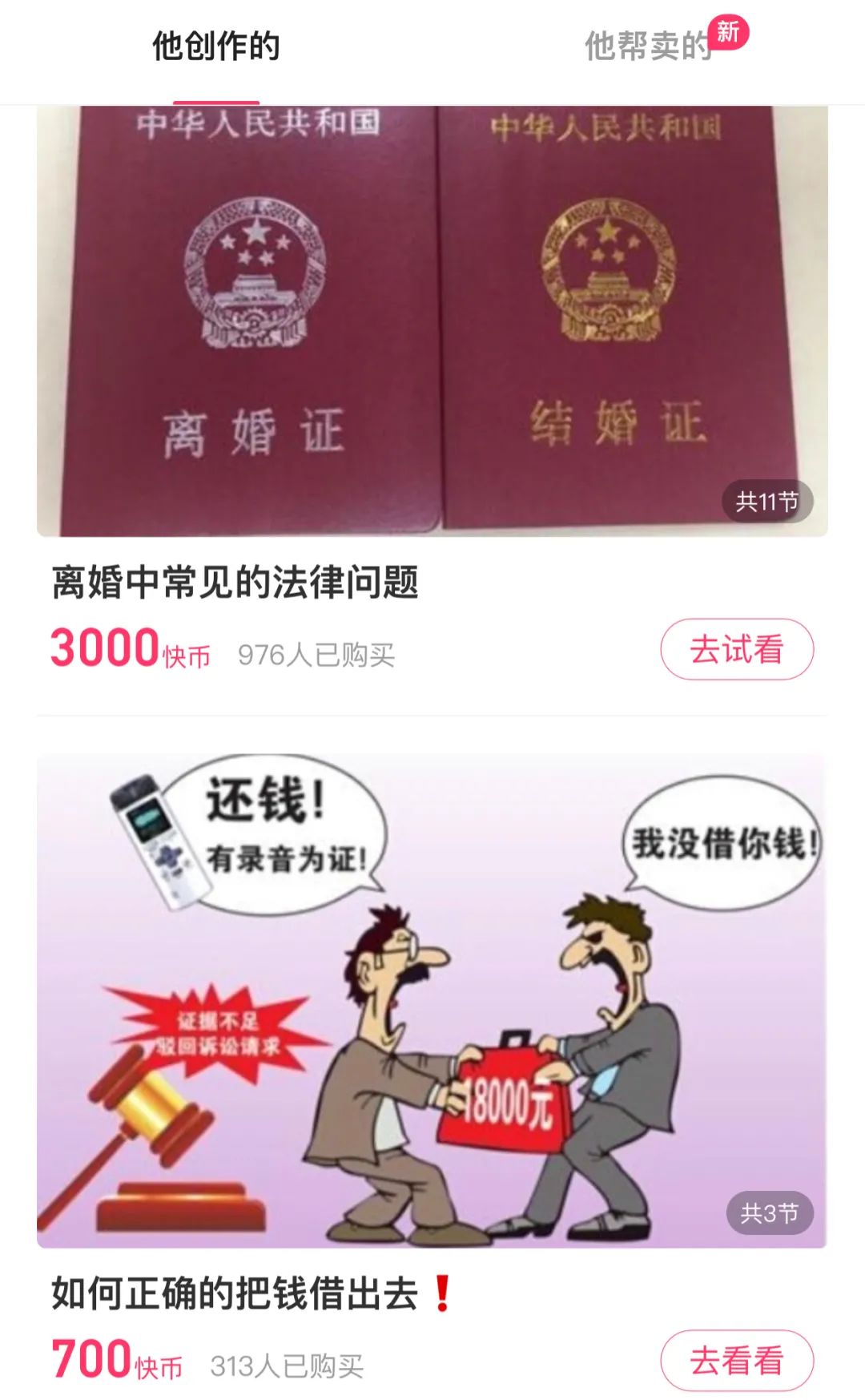 根據直播中粉絲的問題和諮詢,他將其歸納後,錄製了一系列課程。比如「離婚中常見的法律問題」,有近1000人購買。