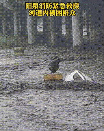 湍急的洪水中,男子站在隔離墩上焦急地等待。