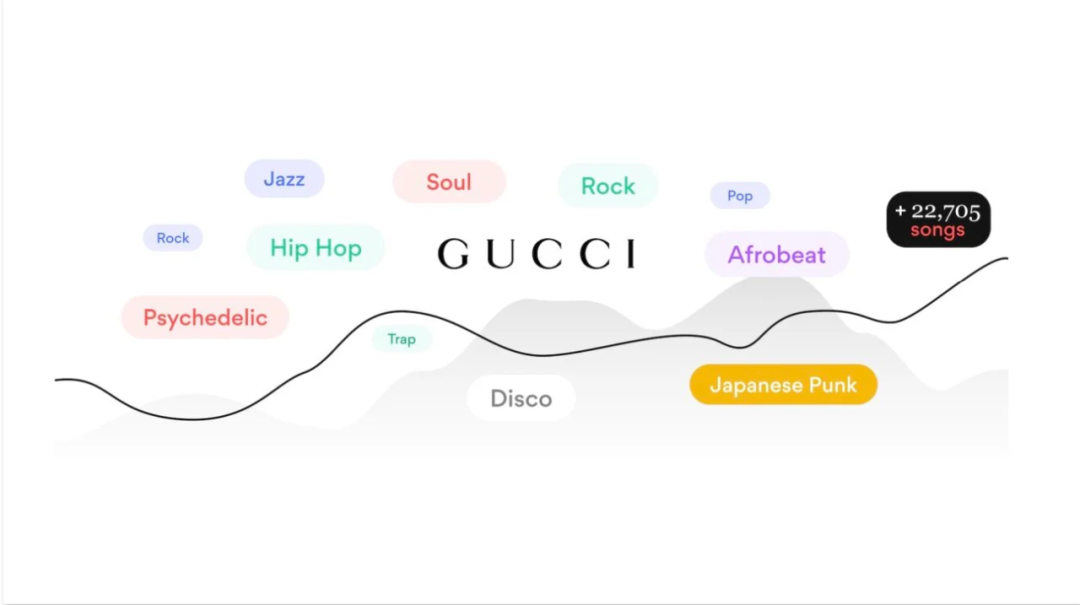在一篇博客文章中,Musixmatch還繪製了跨流派的“Gucci 音樂之旅”,“爵士、迷幻、日本朋克、迪斯科、嘻哈、非洲節拍,這些流派充當了 Gucci 品牌跨越社會各個方面長達一個世紀的音樂背景”。