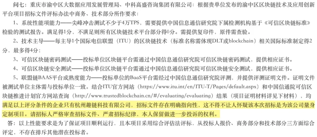 對於部分加分項要求,有投標人表示不解,質疑有定向招標、控標嫌疑,特別是對杭州趣鏈有明確指向性,“這不得不讓人懷疑本次招標是為該公司量身定製項目”。“希望提供一個公平、公正的競爭環境,讓各廠家站在同一起跑線公平競爭”。比如: