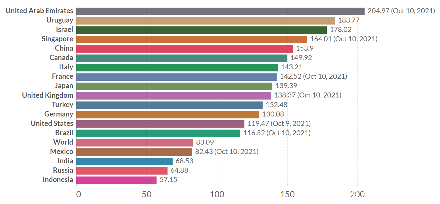世界主要大國**+**部分小國每百人接種劑次(2021.10.11)