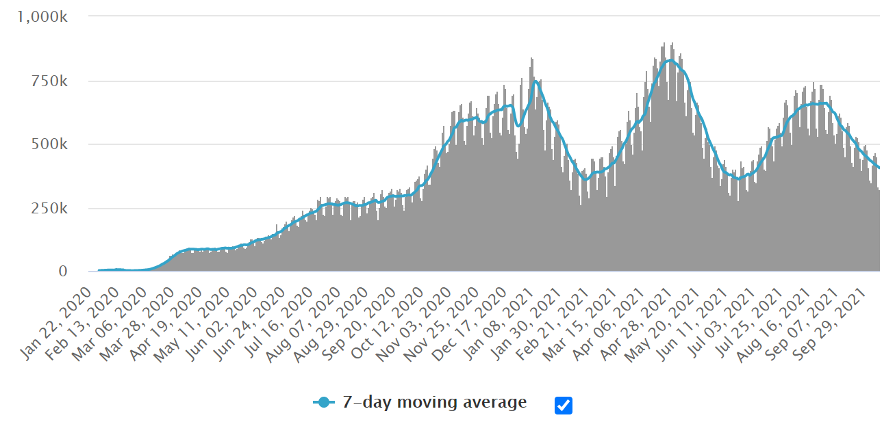 全球單日新增確診病例(2020.1.22-2021.10.11**)**