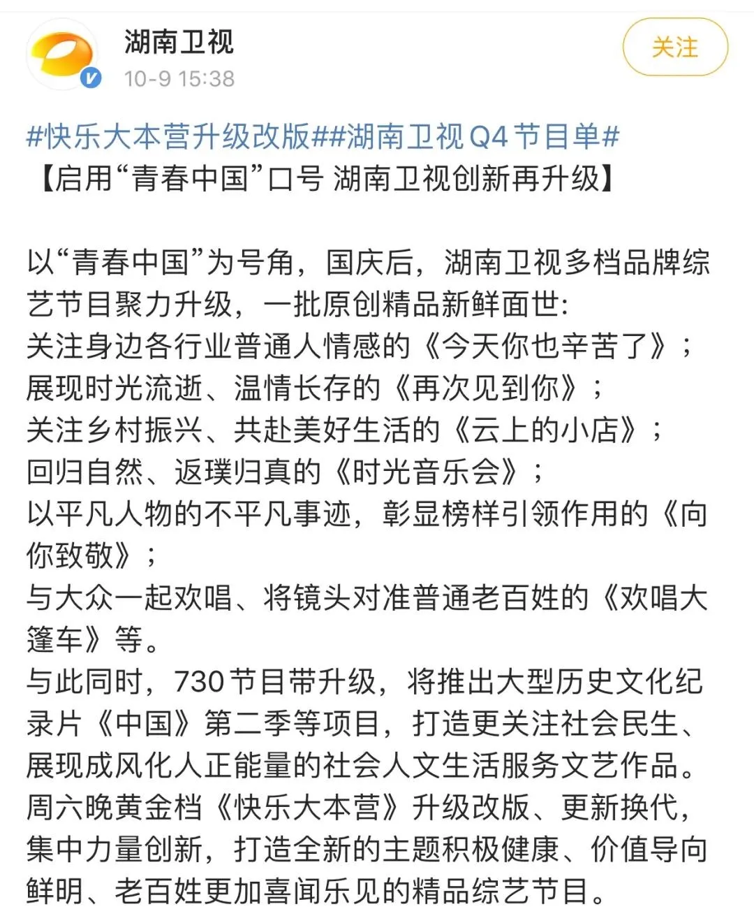 和不少“xx綜N代停播了”一樣,又是虛驚一場。湖南衞視近期公佈的Q4節目單打破了國慶期間的疑雲,不是停播而是改版。説真的,像快本這種長壽節目,幾乎就是內容世界裏的地標建築,縱然你早不看了,也希望它一直還在。