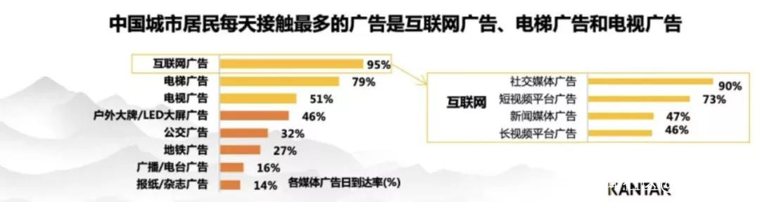 從傳播行業來説,新的形勢下中國的品牌傳播出現了三個重要的趨勢。第一個叫以中心化對抗碎片化。今天城市居民每天接觸最多的廣告是什麼?第一是互聯網廣告95%,第二是電梯廣告79%,第三是電視廣告51%。顯然互聯網廣告接觸率最高,那麼碎片化的互聯網能不能引爆品牌呢,我們為什麼沒有感覺到那麼高的互聯網能引爆品牌,究竟什麼品牌是互聯網引爆的呢?
