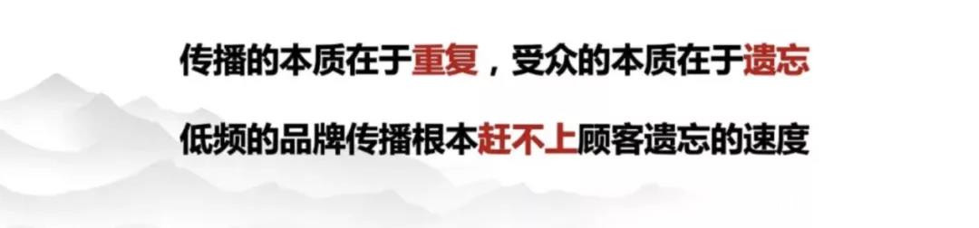 農夫山泉有點甜。這句廣告已經7年沒説了,我們跟農夫山泉合作的7年當中,一直用“大自然的搬運工”。但是農夫山泉有點甜,以前“種“進去了之後就難以改變,它已經牢牢的成為你心智的組成部分。所以低頻的品牌傳播根本趕不上顧客遺忘速度。當世界碎片化的時候你也在碎片化,如果不能聚焦打透,集中優勢兵力形成認知優勢的話,你永遠是很難改變市場格局的。