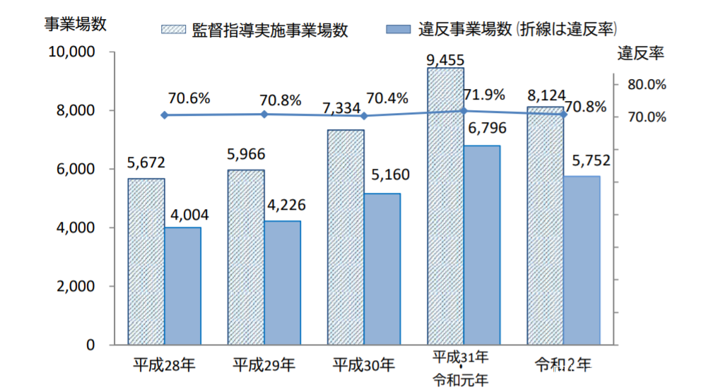 日本厚勞省調查顯示,2016-2020年,違反條例的接收單位始終在七成以上