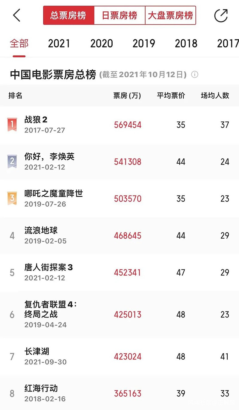 考慮到《長津湖》還在上映,總票房超50億元問題不大,保守估計,至少能排名第三。